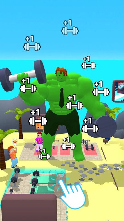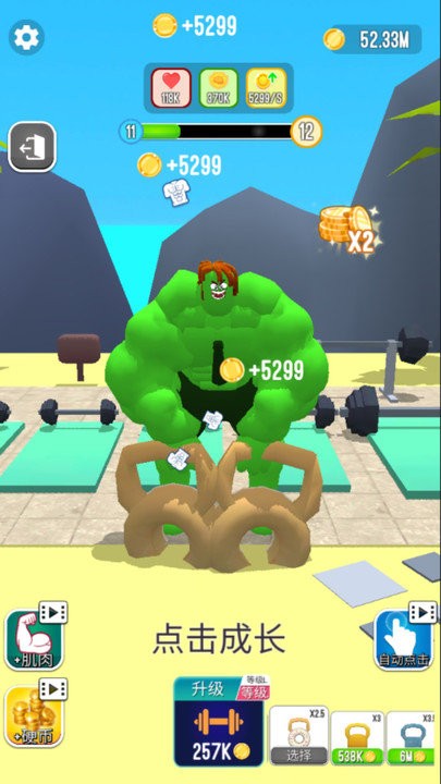 2、前往健身区,点击角色身上闪烁部位如手臂、腿部进行成长,同时来收集场景中的漂浮的金币。