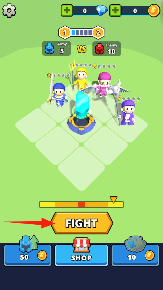 1、战斗准备阶段,确认己方5个单位与敌方10个单位的实力对比,点击FIGHT按钮开启战斗。