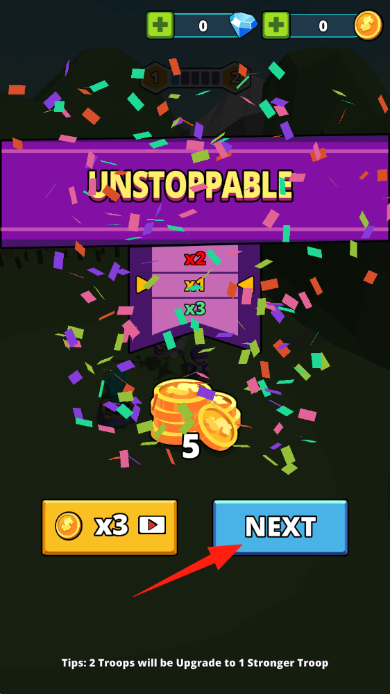 3、战斗胜利后,出现UNSTOPPABLE奖励界面,点击NEXT按钮领取5金币,继续下一轮挑战。
