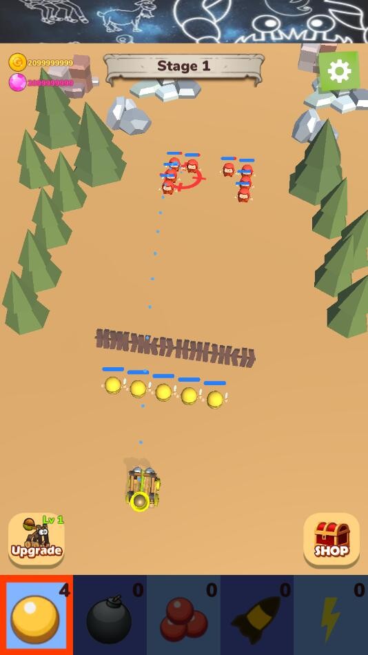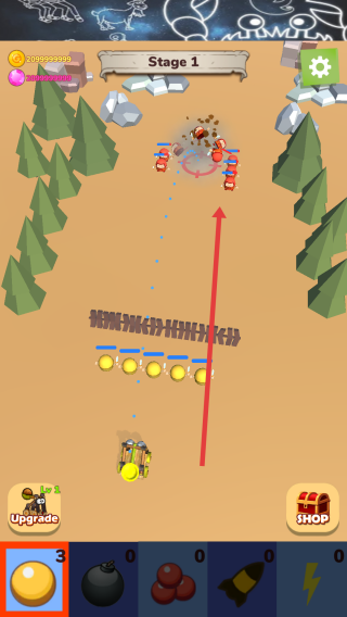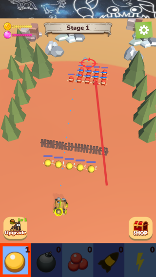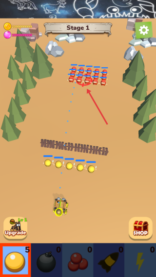 1、进入游戏Stage1关卡,点击底部黄色炮弹图标,向红色敌人方阵发射基础攻击,优先打击集中目标。
