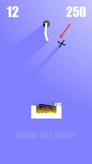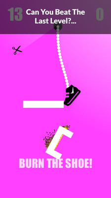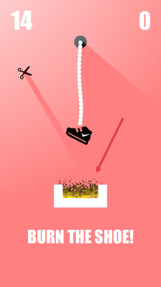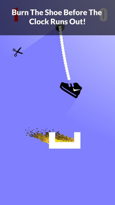 燃烧鞋子是一款轻松愉快容易操作的作品,玩法操作简单,采用新颖玩法与小清新风格,让人爱不释手,无需复杂操作技巧,一分钟即可快速上手,且包含多种挑战模式,带来轻松有趣的游玩体验,作为好玩上瘾的休闲娱乐点击闯关类作品,用户需用剪刀剪断上方绳子,让末端绑着的鞋子成功掉进火堆,注意绳子左右摇晃产生的偏转力,感受独特的闯关乐趣。