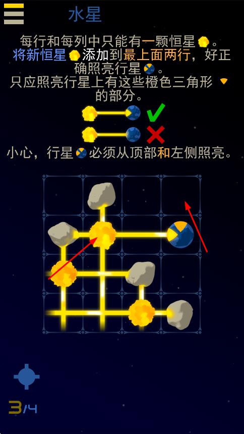 1、观察分析解谜:仔细观察关卡初始小行星分布、特殊天体位置与连接限制条件,制定初步连接计划,预判连接后产生的连锁反应,逐步完善解谜方案。