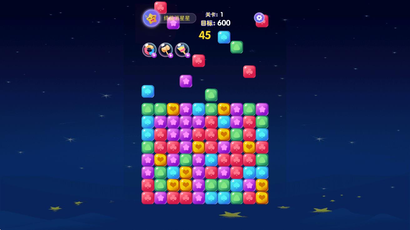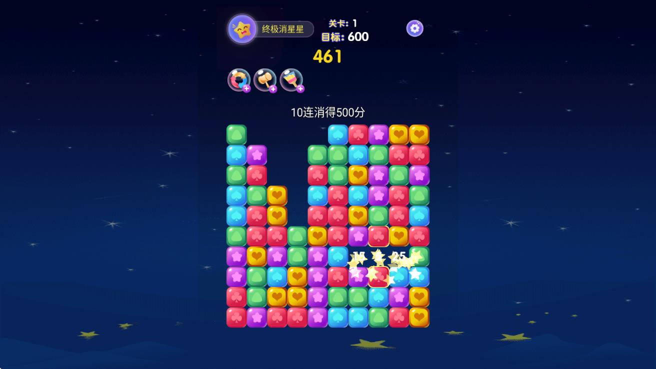 2、连招得分机制:连续消除星星可触发连招加成,消除数量越多、连击次数越高,分数增幅就越明显,带来得分冲刺的竞技乐趣。