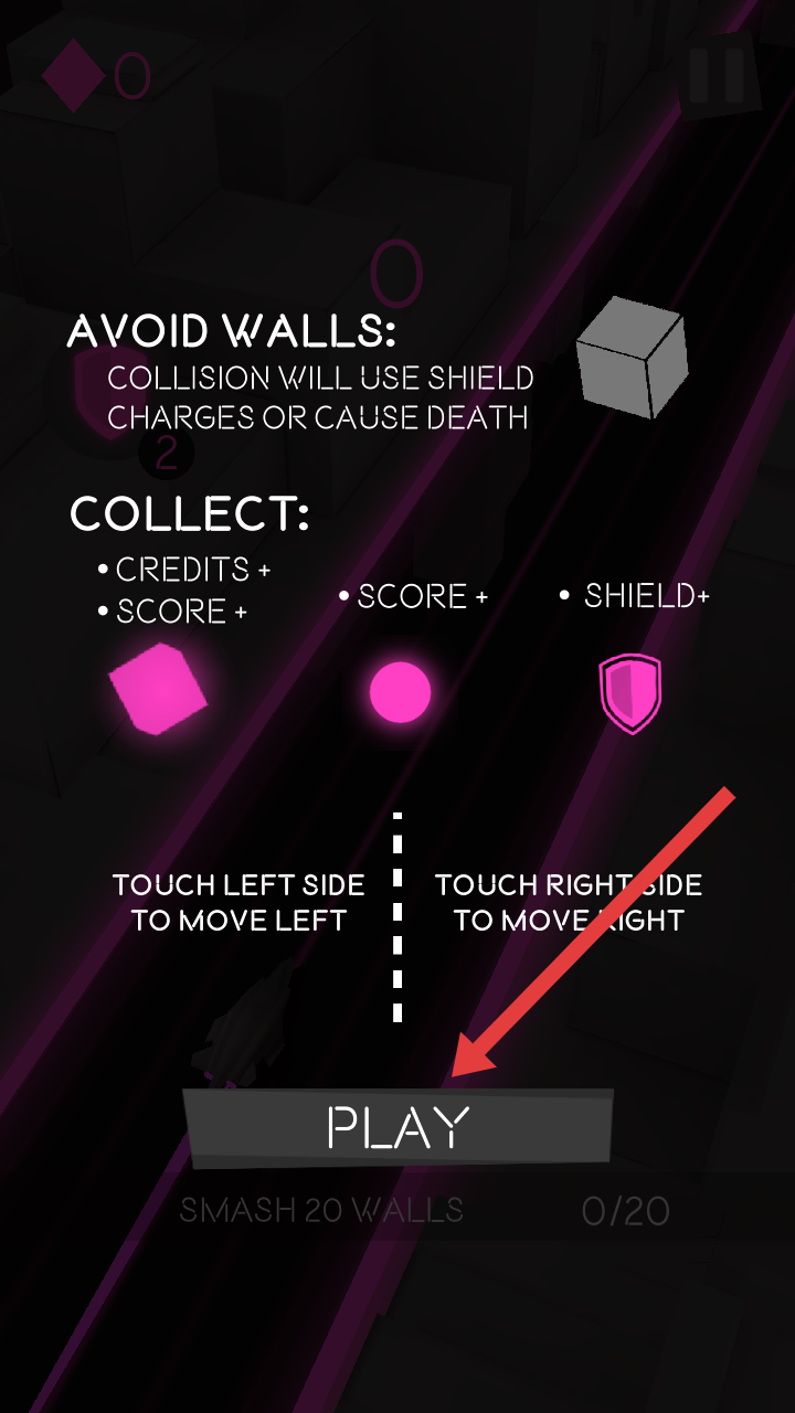 1、点击PLAY开启游戏,牢记规则躲避墙壁碰撞消耗护盾或者致死,收集粉色方块增Credits、Score、粉球增Score。