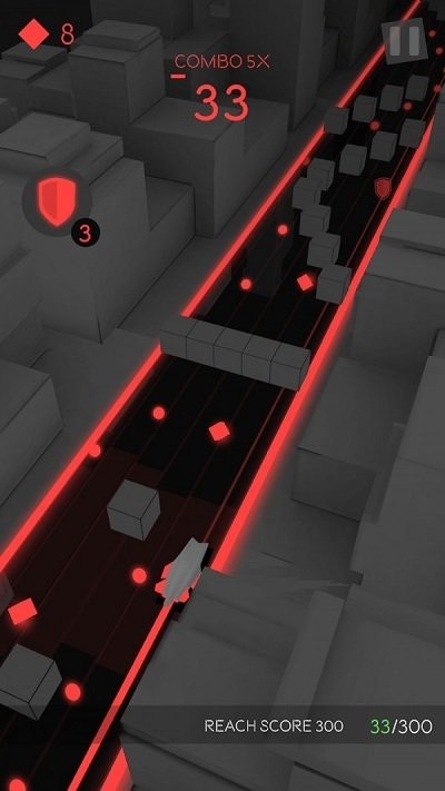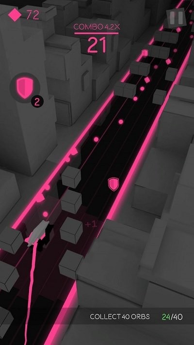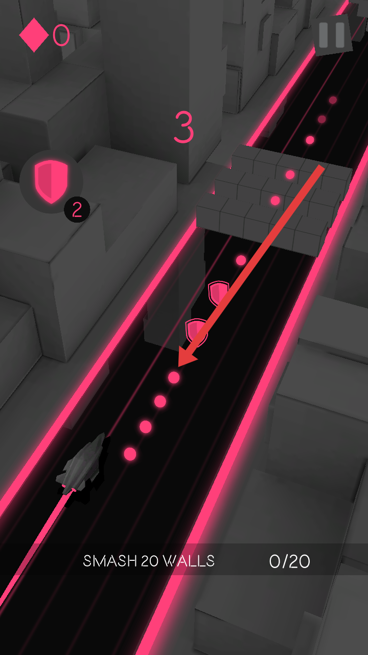 2、游戏中操控飞船沿着粉跑道前行,收集粉色圆点,借助护盾抗墙撞,推进SMASH20WALLS任务,左右移躲障碍。