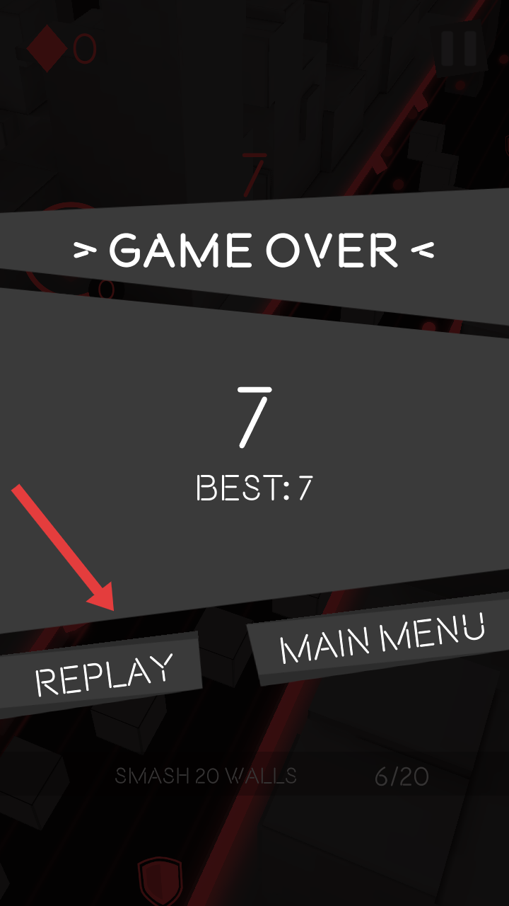 3、在没有护盾的情况下撞到障碍物则结束,结算时点击REPLAY重玩,突破最佳得分7,完成摧毁20面墙目标。