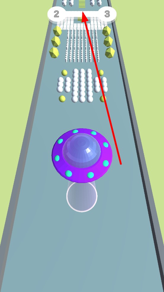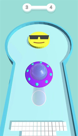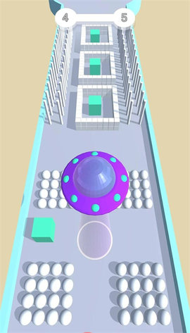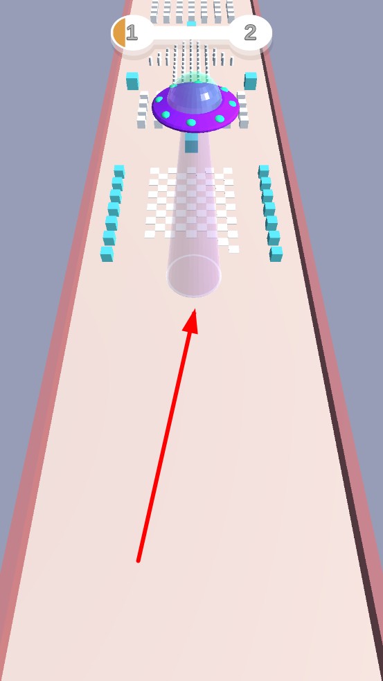 1、进入关卡,滑动屏幕操控飞碟移动,对准管道入口,收集路径上的白色方块,避开蓝色的过大方块障碍,上方进度条随收集推进。