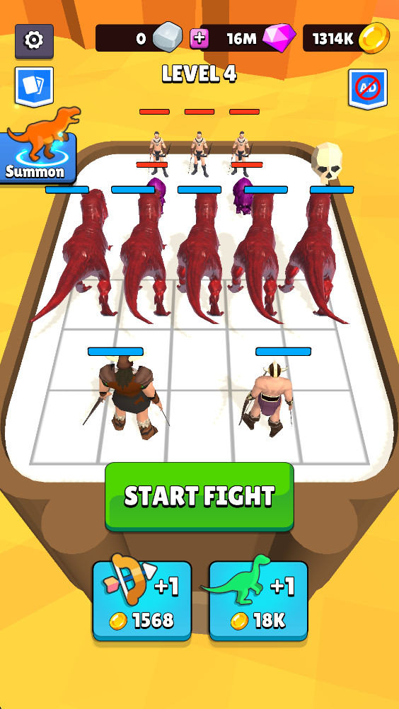 1、合并进化机制:以合并进化为核心机制,通过拖拽相同的基础恐龙或战士完成融合,逐步解锁霸王龙、火焰法师等强力单位,每次合并都在构建专属军团。
