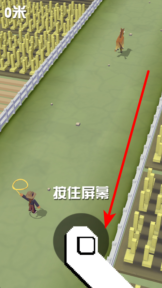 1、开局时看到按住屏幕提示,长按对应区域,让角色保持准备状态,这样才能顺利开始骑乘动物的跑酷流程,为后续套捕动物做准备。