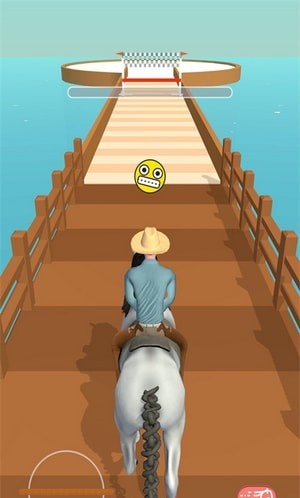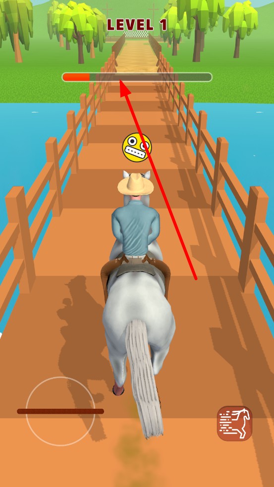 2、改装后进入跑酷关卡,左侧控制方向和停止,右侧让马加速,留意顶部体力条,代表马体力耗尽,需及时慢行。