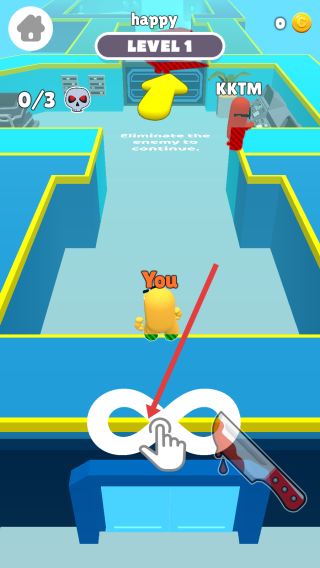 1、进入LEVEL1的关卡,根据底部的提示,操控黄色的角色移动,跟随黄色箭头指引,接近红色敌人。