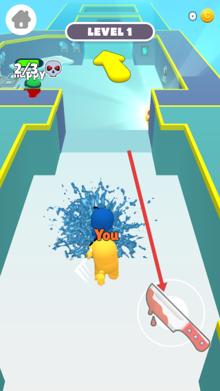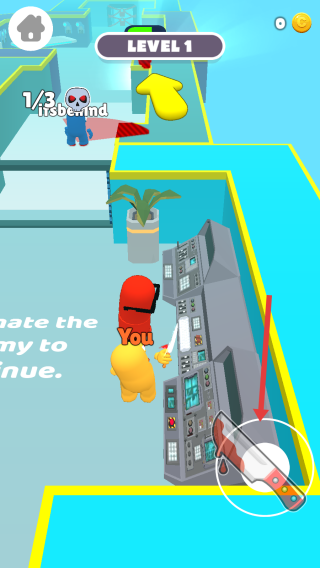 3、在场景中穿梭,借助箭头指引探索路径,遇到敌人如前方的蓝色的角色,及时用刀具攻击。