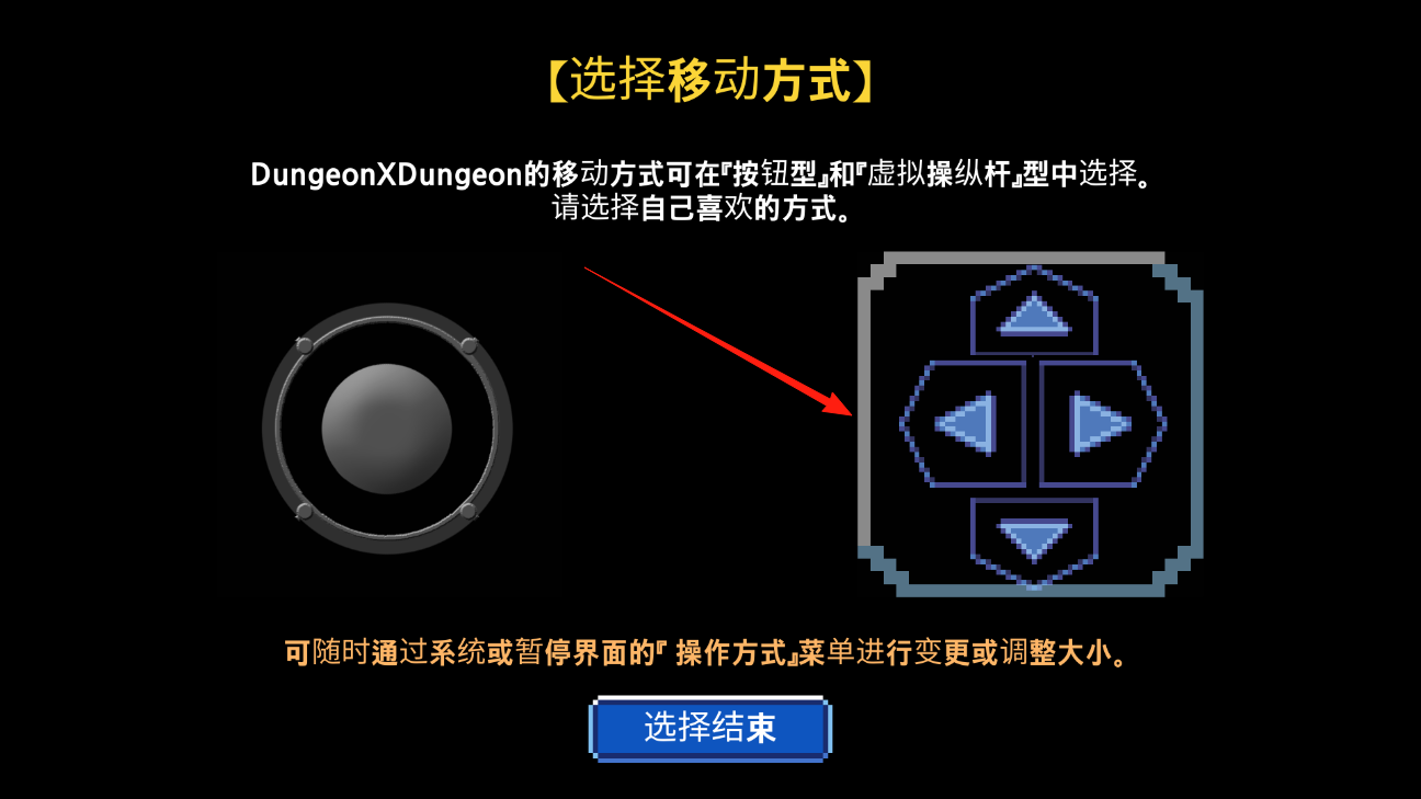 2、到移动方式选择界面,有按钮型和虚拟操纵杆型两种,选右边的按钮型,用上下左右按钮控制角色移动,选好后点选择结束,灵活操控角色去想去的地方。