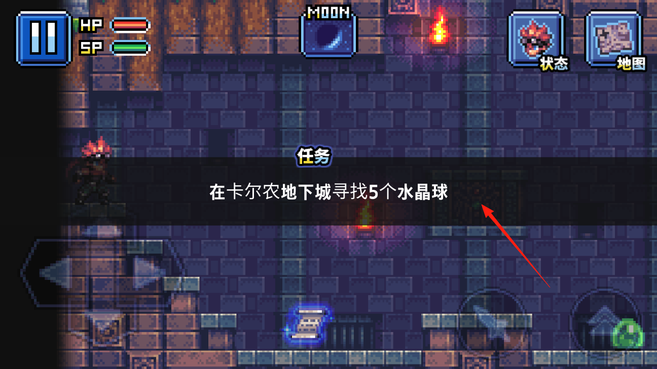 3、进入地下城场景,任务是找5个水晶球,操控角色在卡尔农地下城里跑,注意周围的砖块和火把,仔细搜寻每个角落,了解地下城的布局。