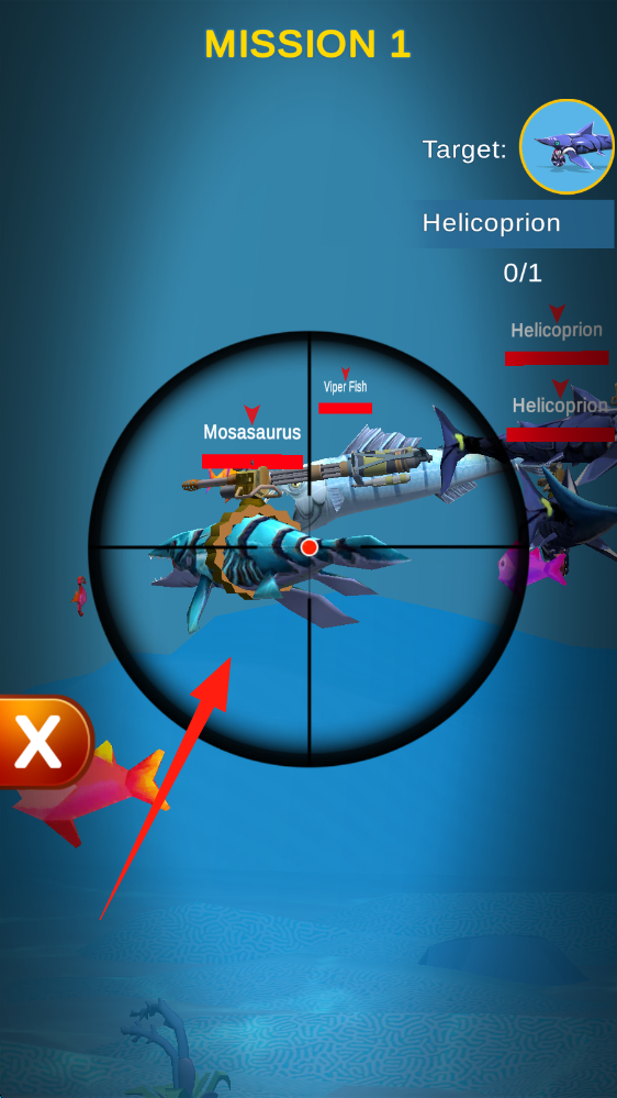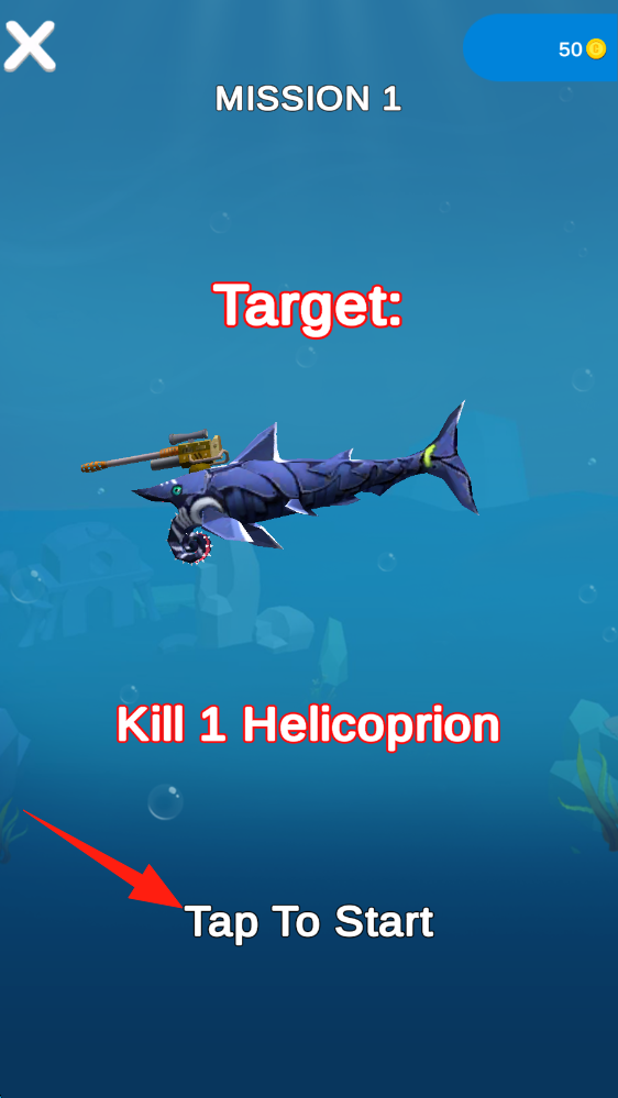 1、点击Tap-To-Start,开启Mission-1,目标是猎杀1条Helicoprion,进入水下狩猎场景。