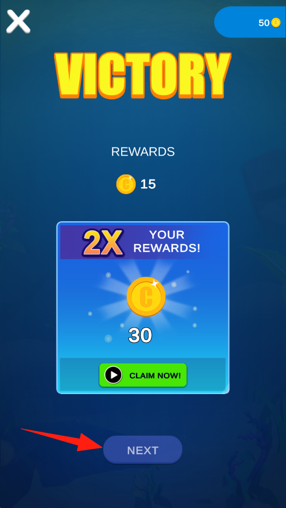 3、胜利界面点击Next,可继续后续任务,也可选择看广告双倍领取15金币奖励,点击下一关。