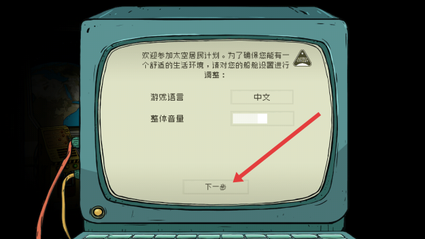 2、在太空居民计划设置界面,在确认好语言与音量后,可以点击下一步,推进游戏初始化流程。