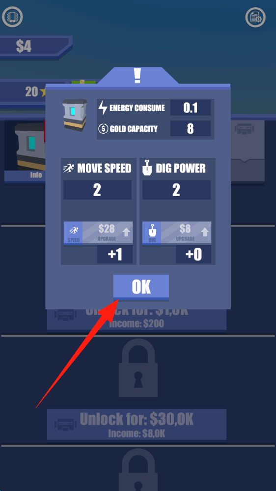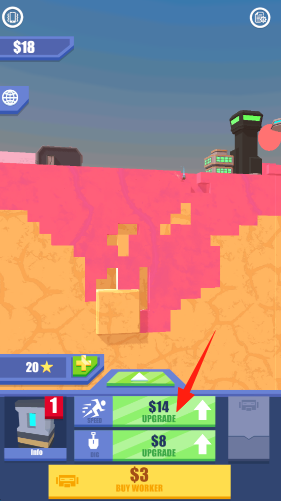 1、花费$14点击上方绿色Upgrade按钮,提升挖掘相关属性,助力后续挖掘任务,点击升级。