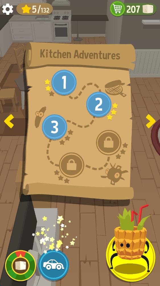 1、进入游戏,选择菠萝、蛋糕等食物角色,在房屋场景中开始奔跑,躲避沿途的障碍物和机关,朝着房间出口前进。