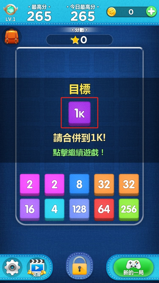 1、进入作品后,我们先明确本局的目标是合并数字到1K,进入游戏后优先找相同数字方块,规划合并路径。