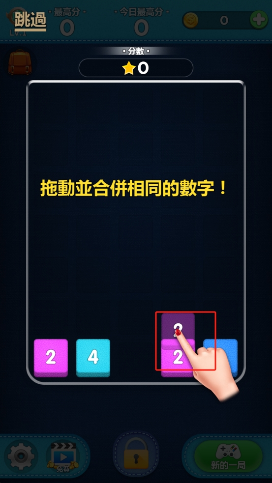 2、进入游戏后会有一段教学,我们先熟悉一下操作,找到相同数字拖动叠加合并,逐步增大数字。
