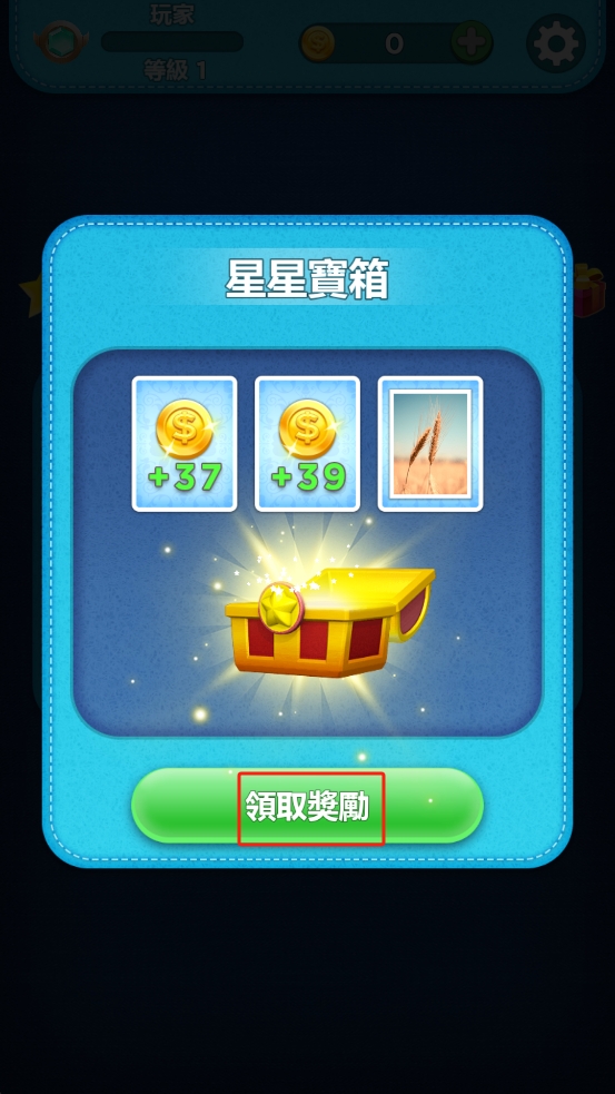 3、完成合并任务后,出现星星宝箱界面,点击领取奖励,获取金币与道具,为下一局积累资源。