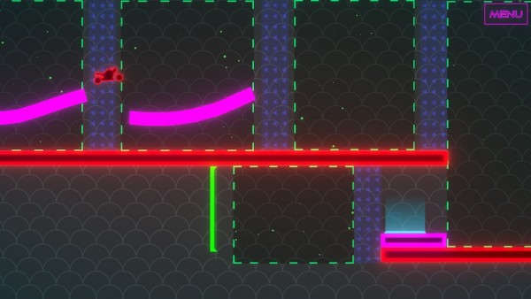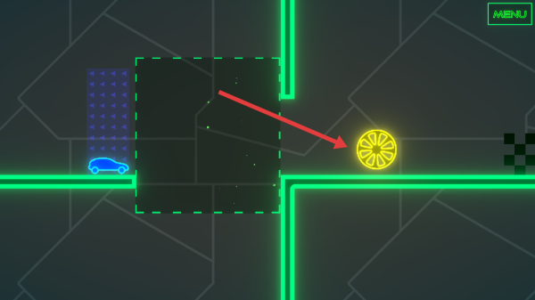 2、驾驶小车沿绿色轨道前行,瞄准黄色核心目标,避蓝色障碍,如箭头墙,规划路线冲过终点。