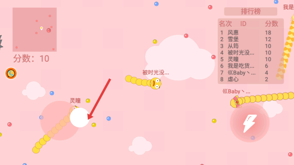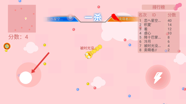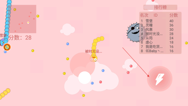 3、留意右侧排行榜,关注高分玩家如雪堡40分,学习走位策略,同时利用右下角闪电技能。