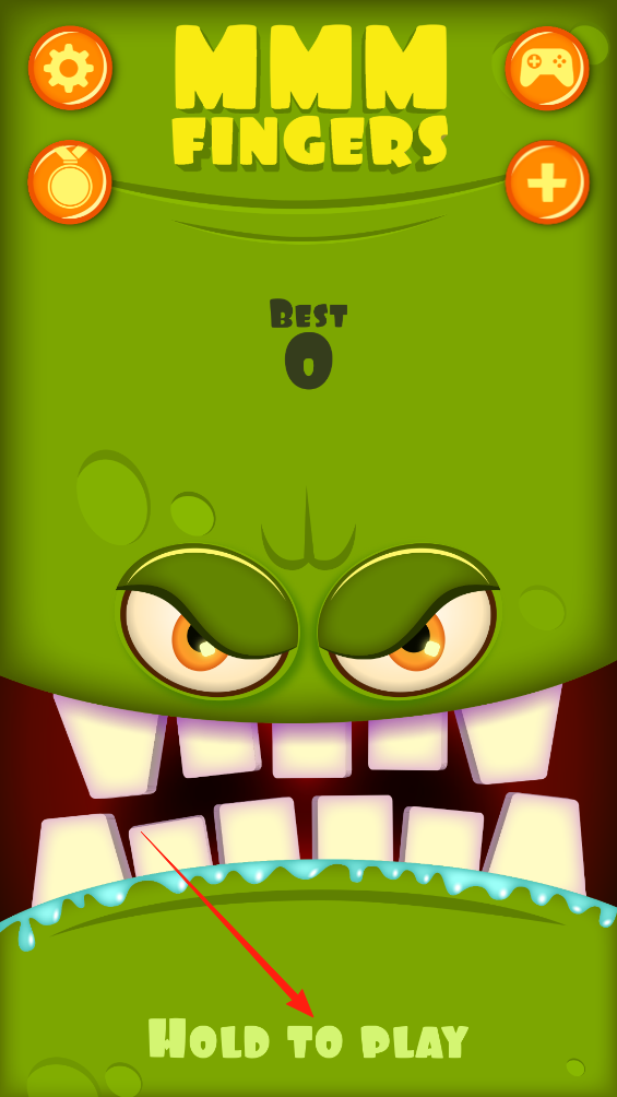 1、看到游戏主界面,有个绿色的大怪物,下面写着Hold to play,长按屏幕,就能开始游戏,然后要小心怪物的牙齿,别让手指被它咬到,同时看看能坚持多久,争取拿到高分。