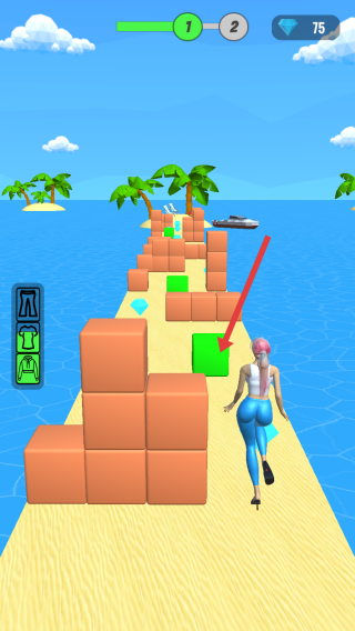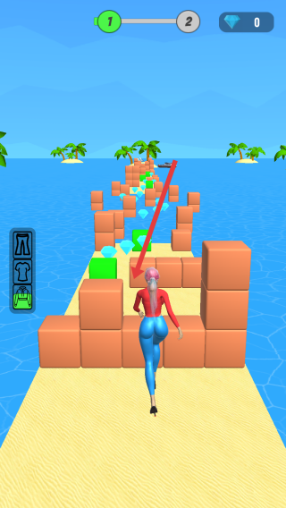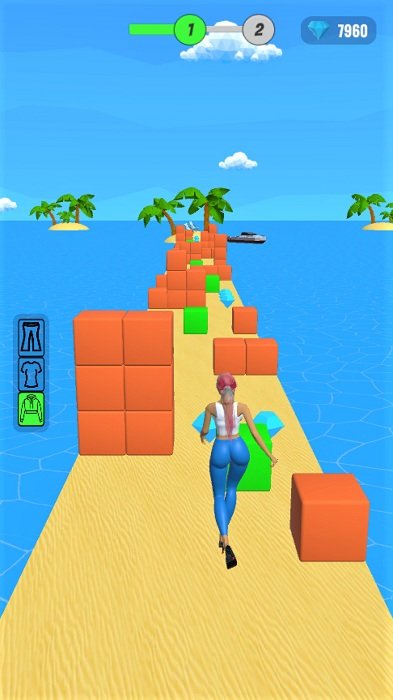 1、进入游戏,操控角色在沙滩跑道上奔跑,遇到橙色方块障碍,左右滑动屏幕躲避,收集蓝色钻石。