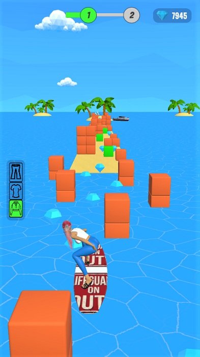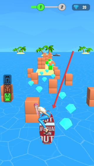 1、奔跑竞速收集物品:操控角色在沙滩和海上不断奔跑竞速,沿途收集道具、金币和宝石,这些物品可用于解锁新的道具与服饰,提供帮助。