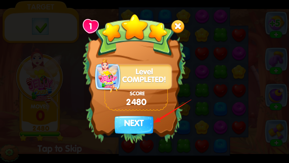 3、这关完成啦,屏幕上显示Level COMPLETED,还有得分和星星评价,点NEXT按钮,就能进入下一关,继续挑战新的果冻消除任务,争取下一关也能拿到好成绩。