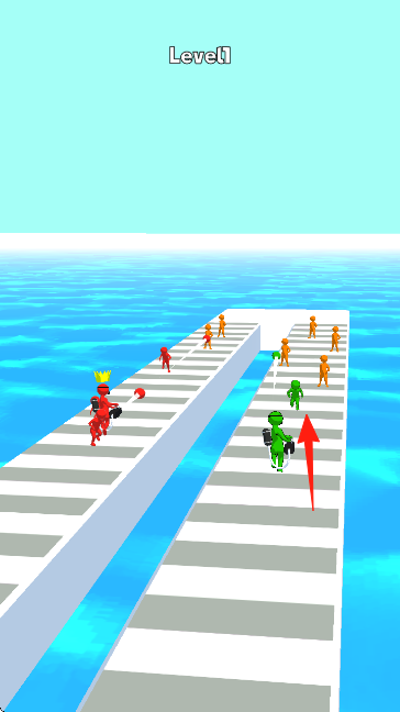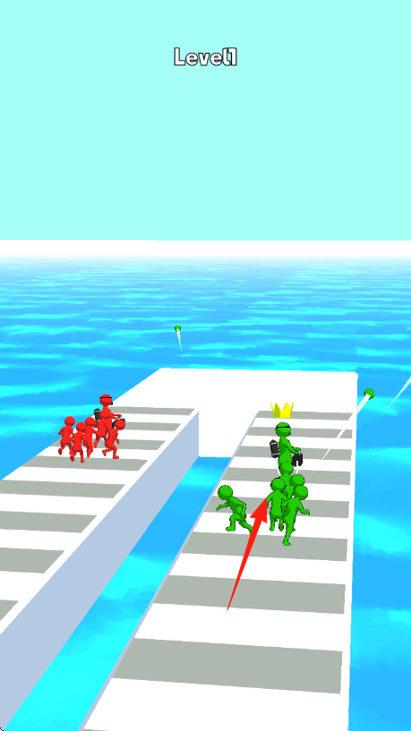 1、操控初始的绿色火柴人队伍,顺着箭头指引的方向在通道上前进,沿途不断吸纳散落在通道上的绿色小人,让队伍规模逐渐壮大。
