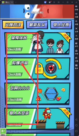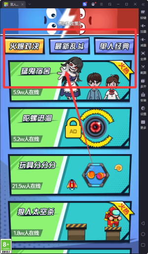 4、双人乱斗模拟器是趣味小游戏合集,玩家可以在手机上与朋友同屏对战。同屏对战模式让玩家能够面对面地进行游戏。