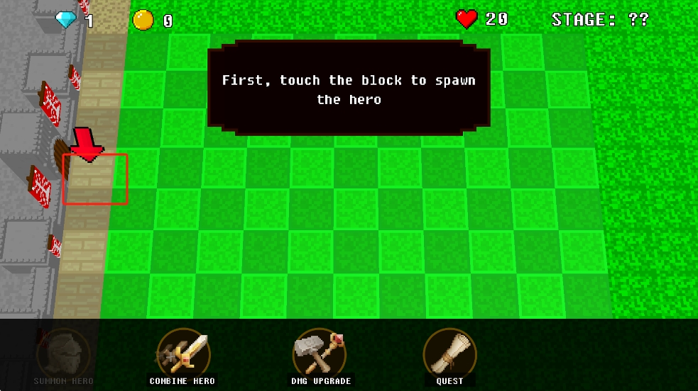 1、我局我们按照提示触摸红框内的方块,召唤英雄到达战场,开启游戏的流程,为后续战斗做准备。
