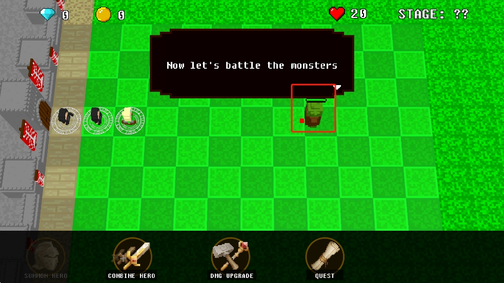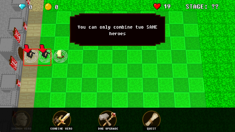 3、我们还可以拖动红框内两个相同英雄,至下方COMBINE HERO按钮,合并升级,提升英雄战力,应对更强怪物。