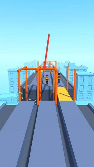 3、通过橙色栏杆区域时,根据箭头提示,提前调整位置,从开放通道穿过,避免碰撞,持续奔跑。