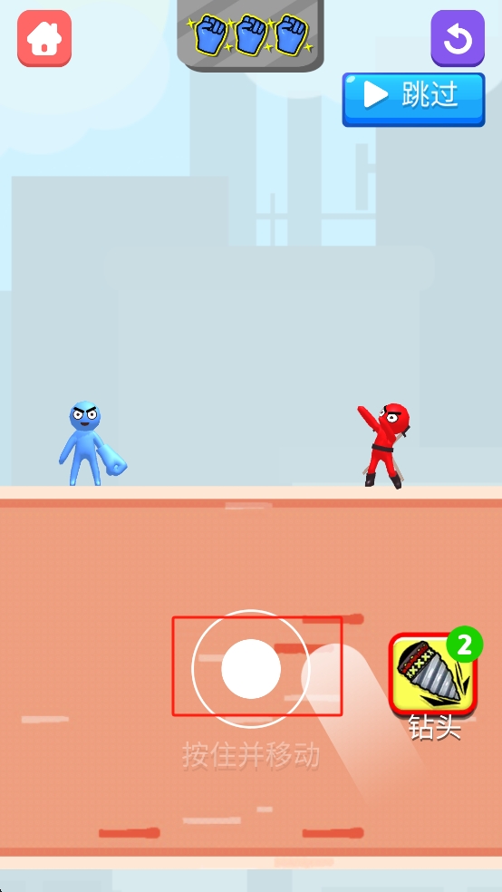 2、拖动蓝色角色手臂,让其精准延伸击中红色敌人,利用手臂攻击机制,确保命中造成伤害,快速击败对手。