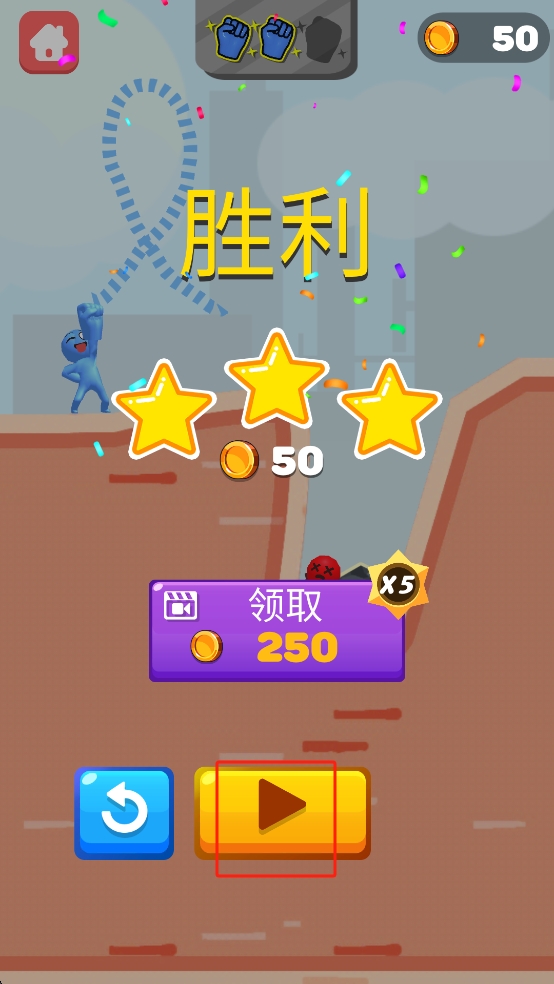 3、胜利后,点击屏幕下方的三角形按钮,进入下一关,继续挑战新敌人,积累金币解锁道具,提升战斗能力。