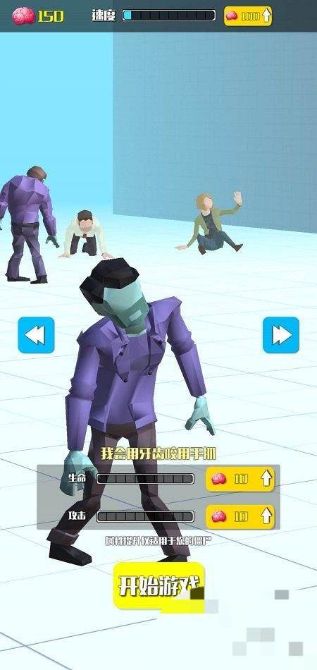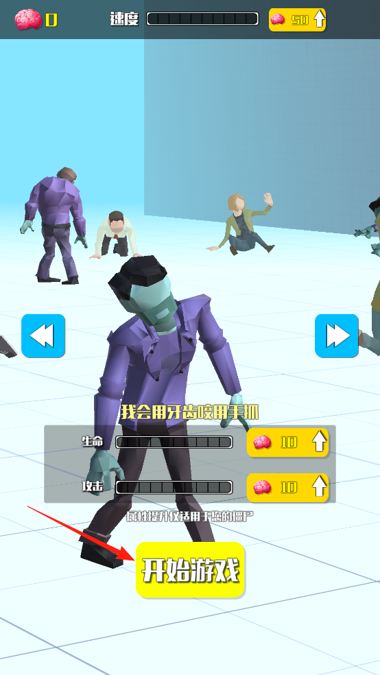 1、操控紫色僵尸攻击路人获取大脑,每咬到一个人就能增加经验值,生命和攻击属性都能用100个大脑来升级,速度条会决定你的移动频率,记得优先提升攻击力才能更快击败对手。