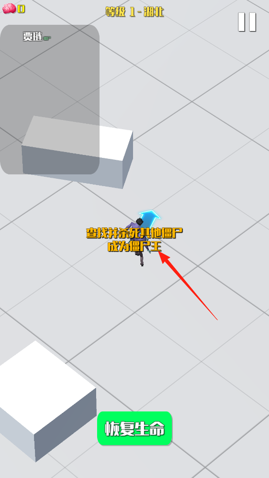 2、在湖北地图里寻找其他僵尸对决,贾胜是你的首个目标,血量不足就点恢复生命按钮,左上角会记录你收集的大脑数量,成为僵尸王需要击败所有竞争者。
