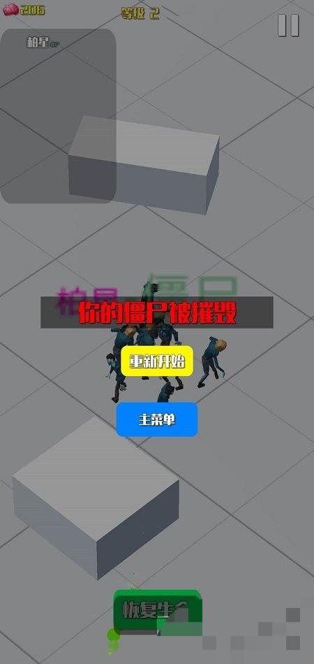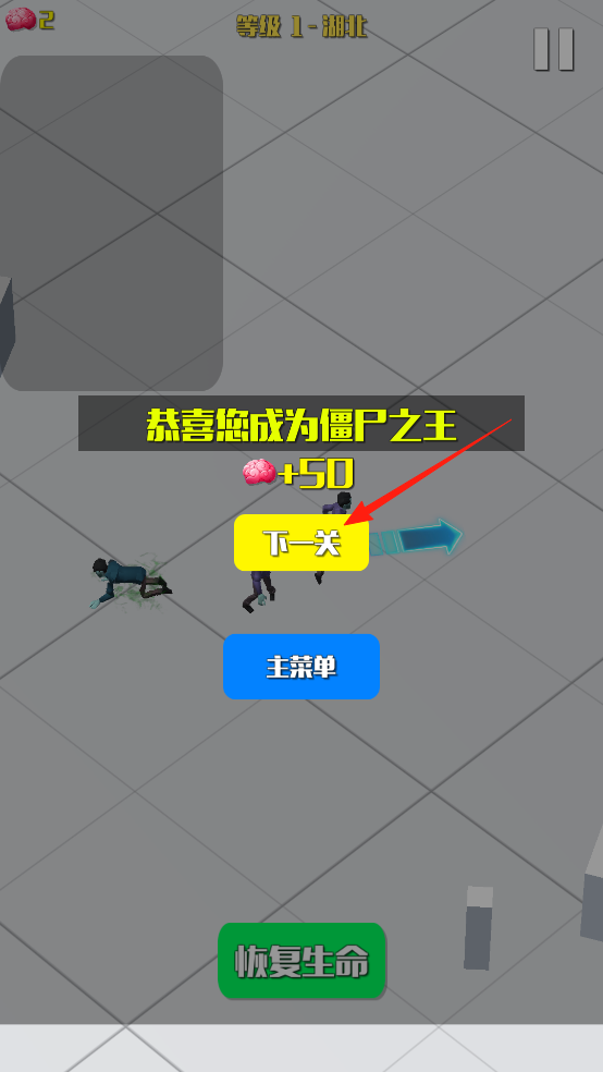 3、成为僵尸王会奖励50个大脑,想继续挑战就点下一关按钮,主菜单可以查看所有成就,恢复生命功能在每关结束后都能免费使用一次。