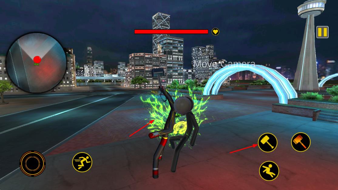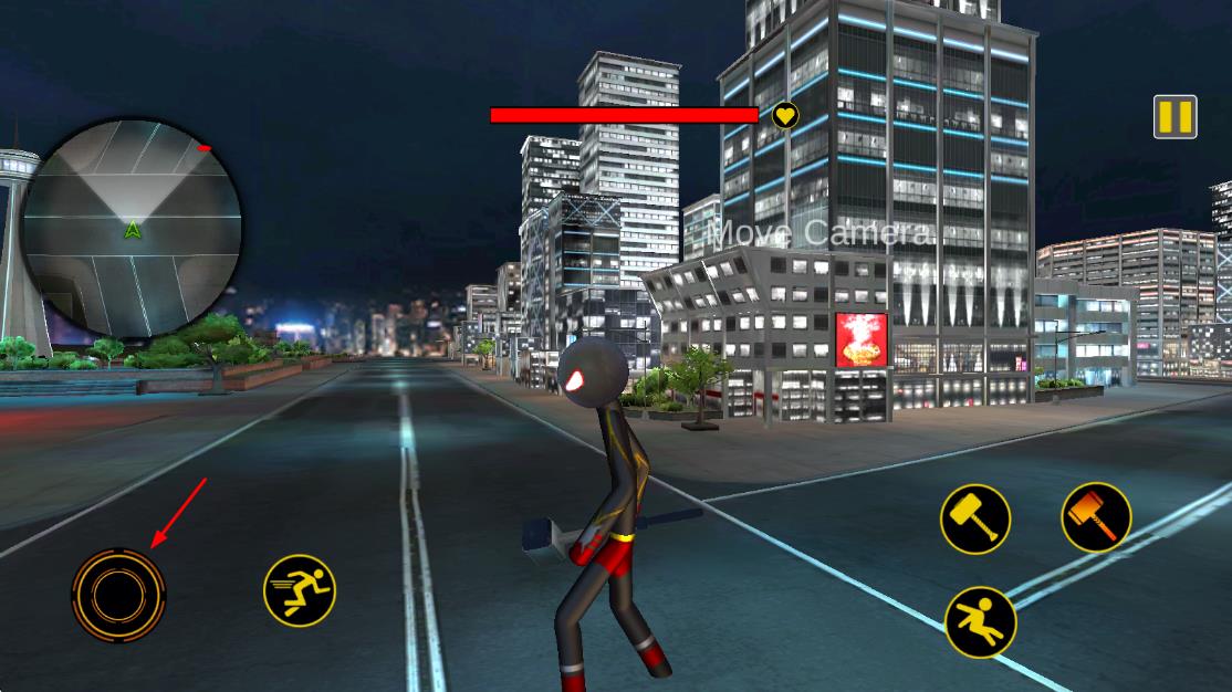 1、进入游戏后选择初始火柴人角色,在战斗界面熟悉虚拟按键操作,通过点击与滑动释放基础攻击与技能。