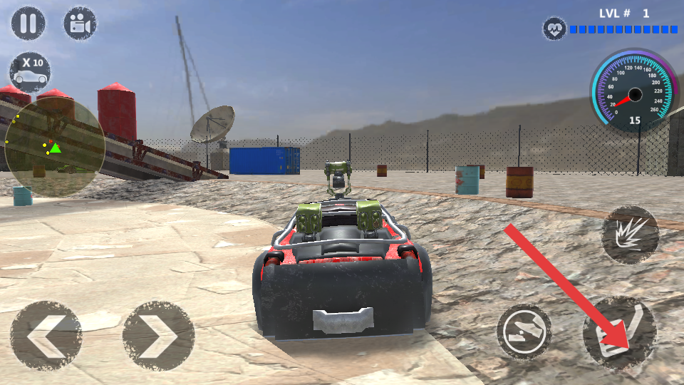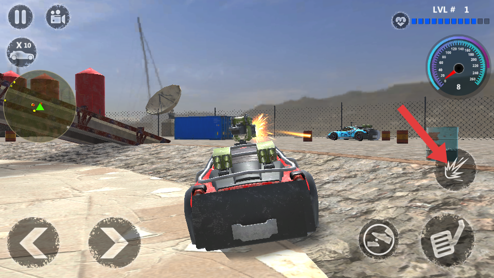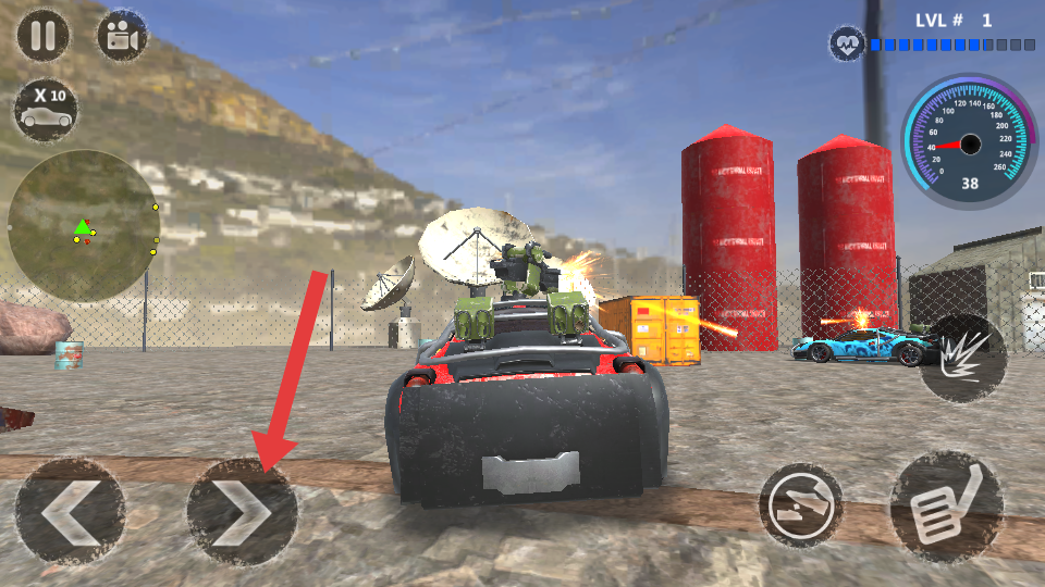 1、进入游戏第一关卡,用左下角左右箭头控制的车辆移动,瞄准蓝色汽车等敌车目标,点击右侧攻击按钮攻击。
