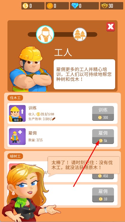 1、进入游戏,与秘书丽莎交互后,进入工人界面,雇佣伐木工训练工人,安排其在森林伐木。