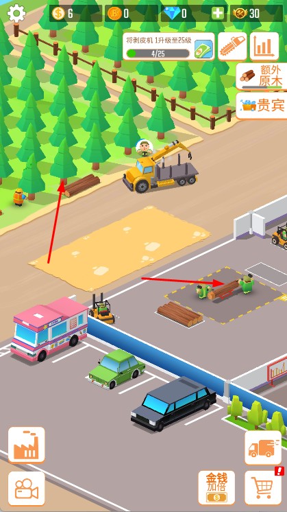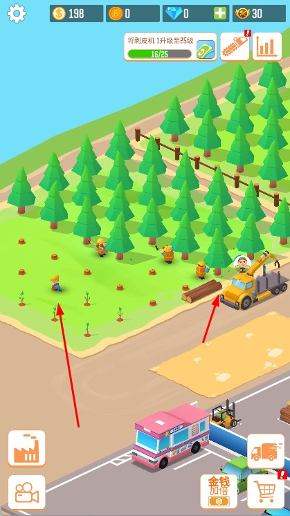 2、设备升级与产能优化:用金币升级伐木工具提升砍伐速度,解锁更大容量的运输车减少运输次数,根据各环节瓶颈调整升级顺序,提升整体产能。