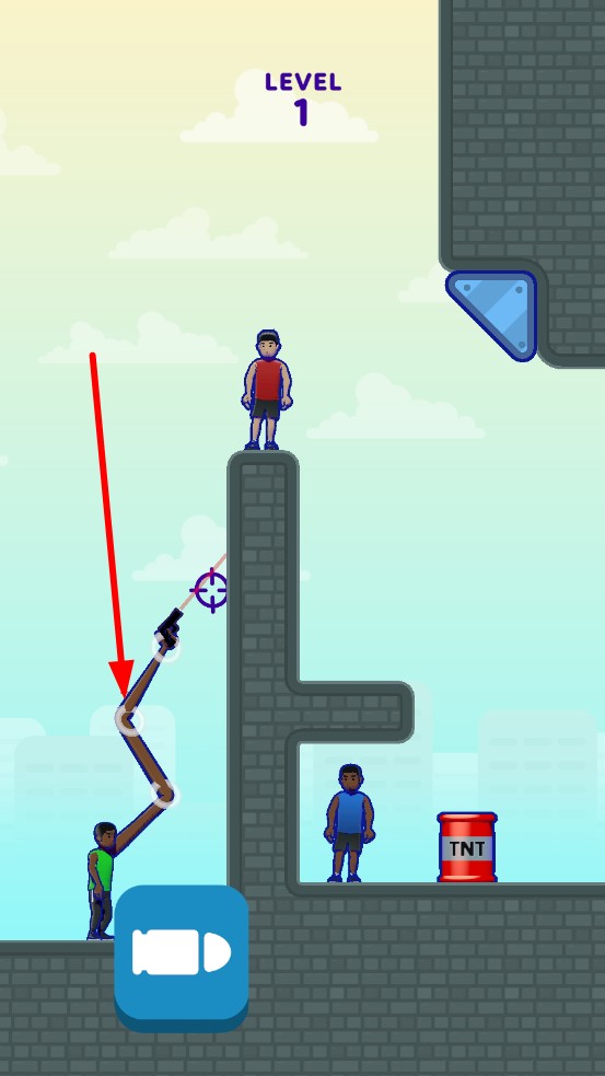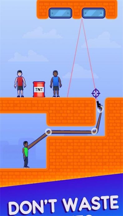 2、面对复杂布局,规划机械臂弯曲路径,尝试命中掩体后的敌人,或引爆TNT桶,清除分散的敌人与障碍。