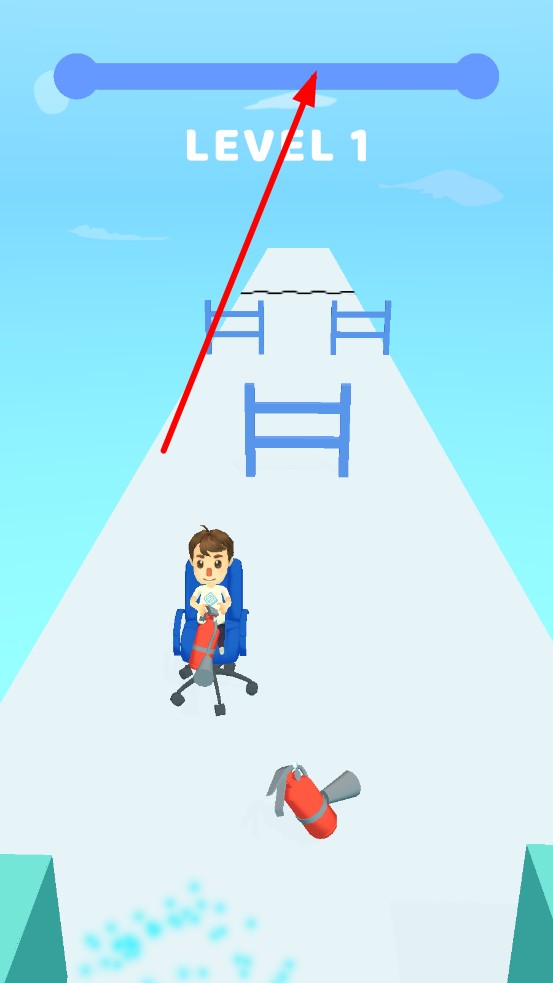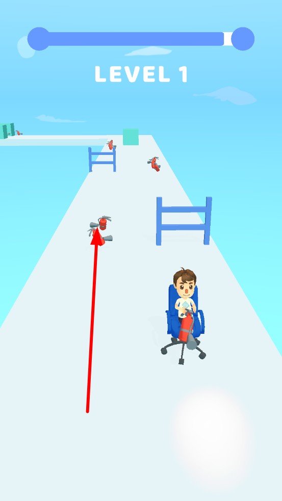 1、进入关卡,滑动操控办公椅转向,点击灭火器喷气加速,优先收集散落在赛道的小型灭火器补充推进剂,避开初始的矮栏障碍。