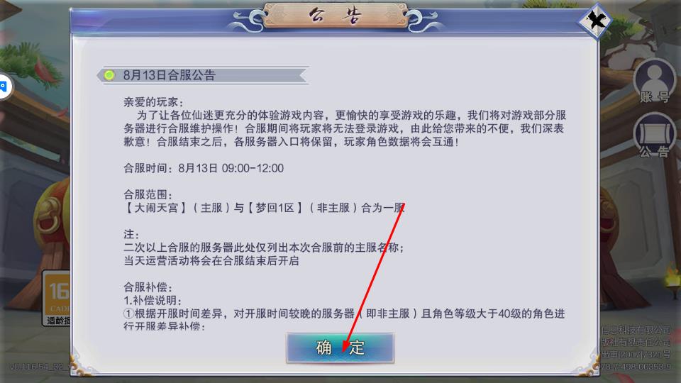 2、阅读合服等公告内容后,然主要点击确定关闭公告弹窗,观察阅读,最后返回登录界面。