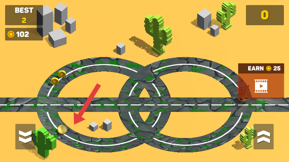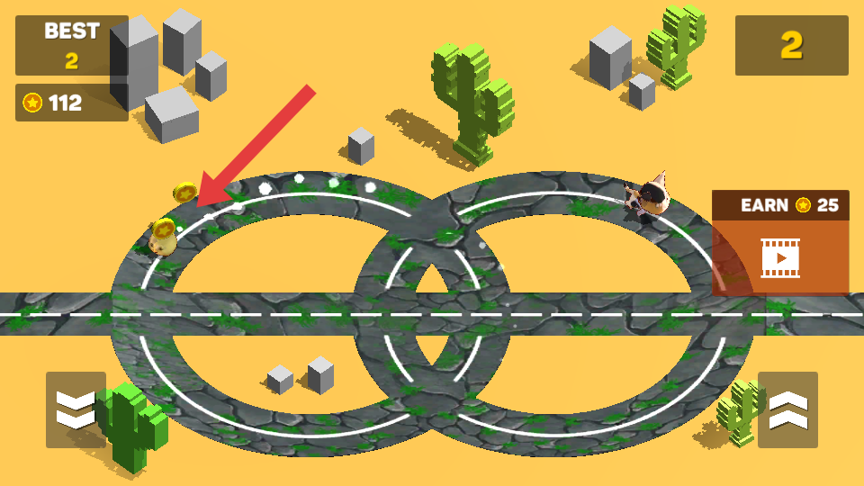 2、在行驶中,避开灰色的方块、仙人掌的障碍,保持绕圈的节奏,积累金币左上角来显示,提升跑圈的距离。